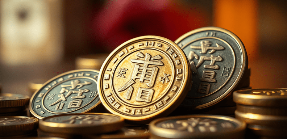 Pirita jade y moneda China en su bolsa de tela amuleto